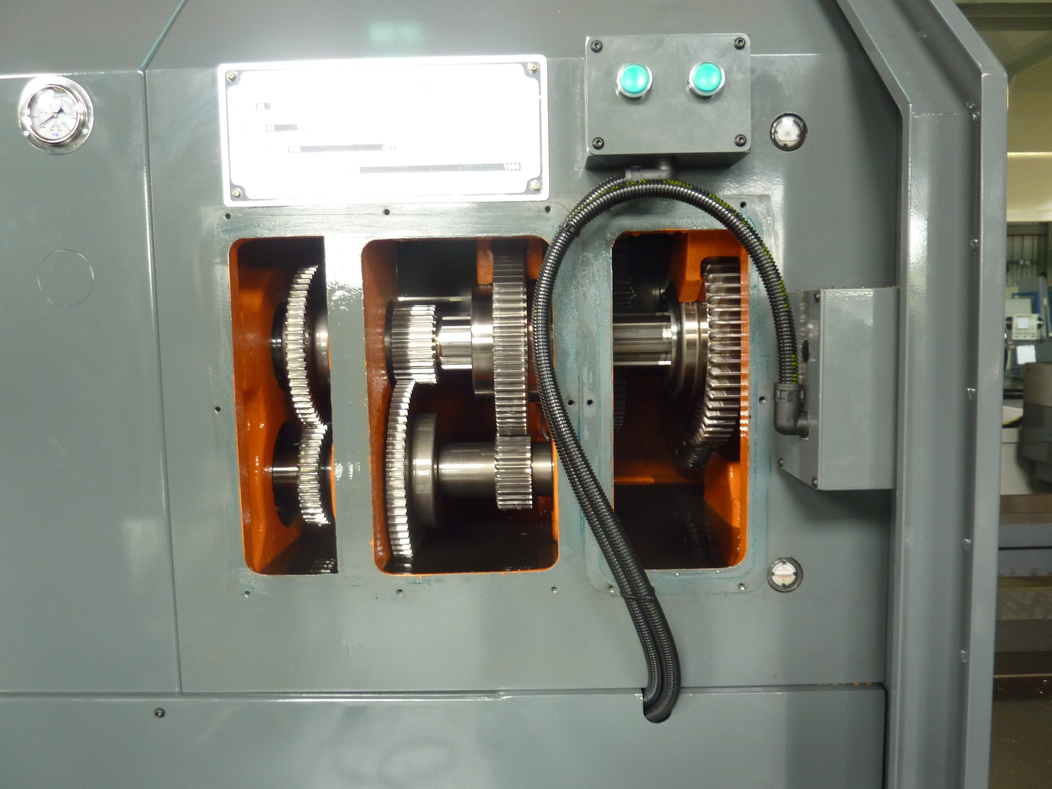 Шпиндель станка установлен в массивном литом корпусе передней бабки и имеет 3 опорные точки для роликовых радиально-упорных и шариковых радиальных двухрядных подшипников фирмы NSK (Япония). В корпус передней бабки установлен 4-х скоростной редуктор, который позволят переключать скорости в автоматическом режиме по М-коду. Редуктор обеспечивает высокий крутящий момент – 15690 Н∙м при 26 об/мин.